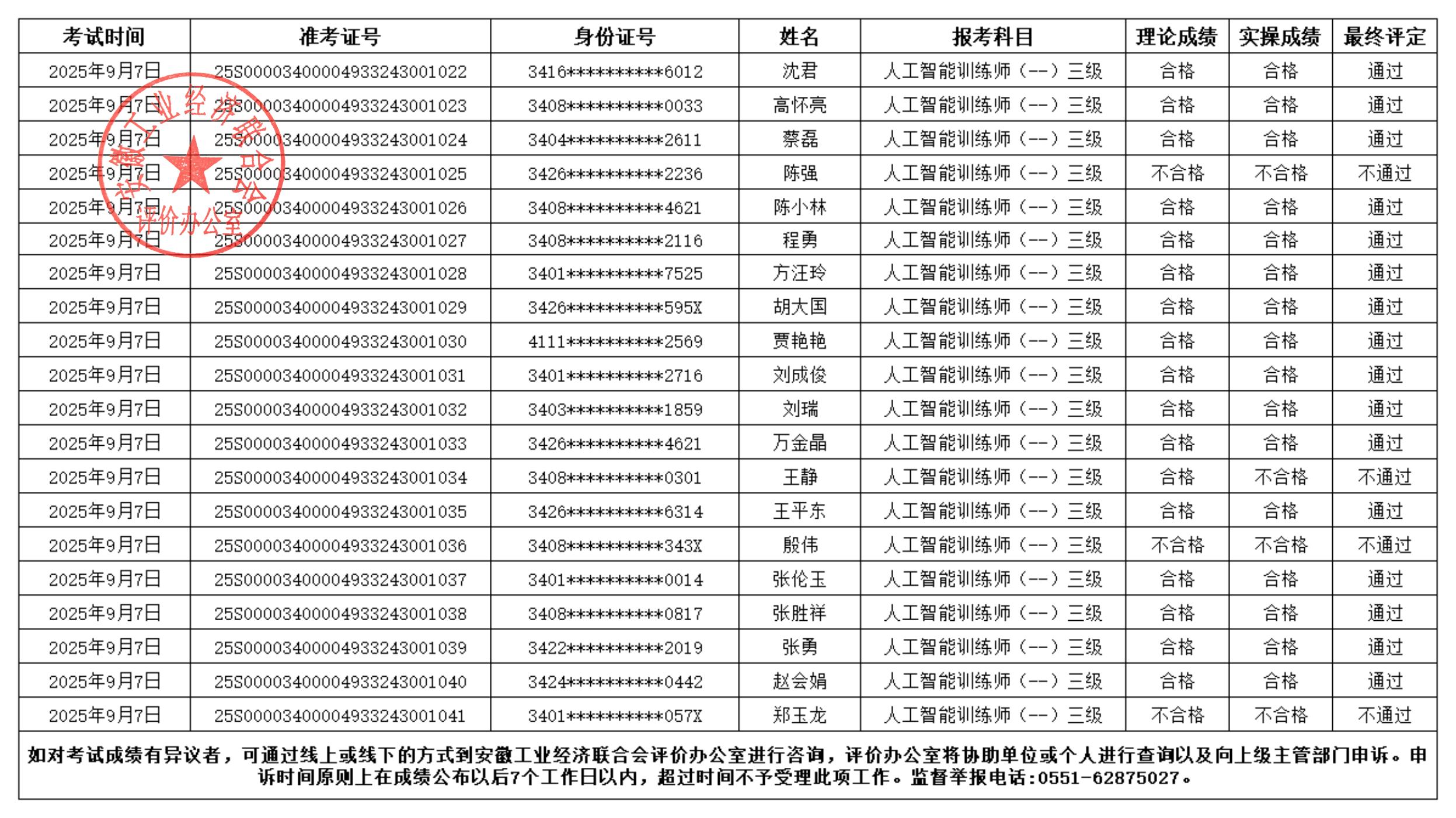 【成绩公示】2025年总第6期职业技能等级认定—人工智能训练师三级成绩发布